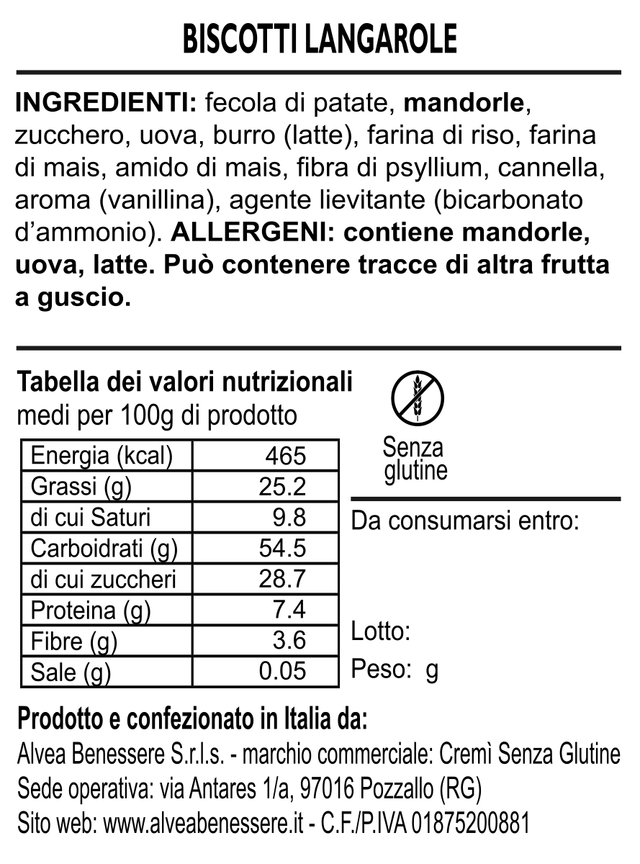 Croccanti e dorati, i Biscotti Langarole Cremì Senza Glutine nascono dalla tradizione e si arricchiscono della presenza di mandorle intere e a pezzi, che regalano una consistenza rustica e un gusto intenso. La ricetta, tramandata con cura e rivisitata per garantire trasparenza e sicurezza alimentare, unisce farine selezionate, burro e uova.