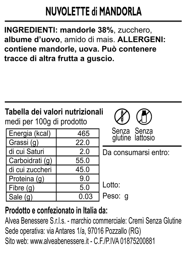 INGREDIENTI: mandorle 38%, zucchero, albume d’uovo, amido di mais. ALLERGENI: contiene mandorle, uova. Può contenere tracce di altra frutta a guscio.
