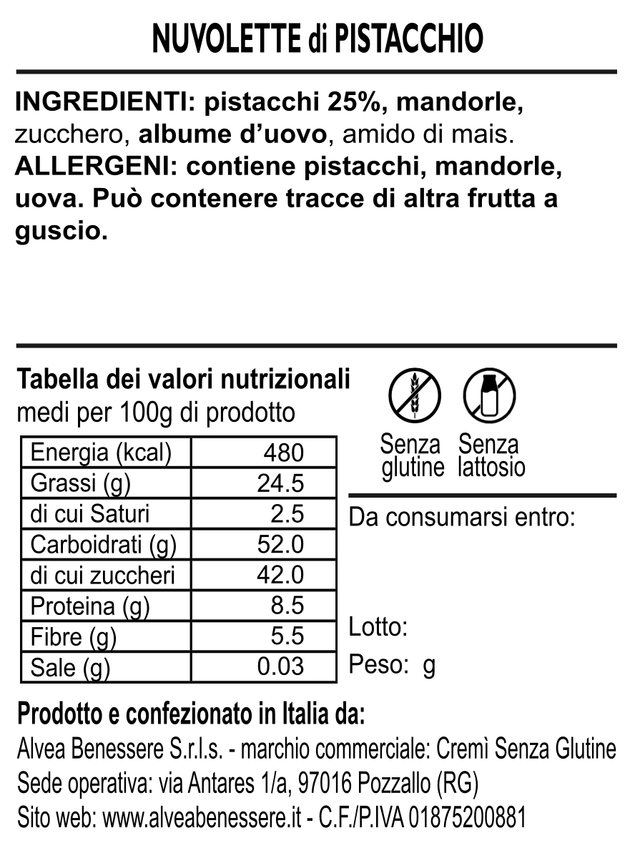 INGREDIENTI: pistacchi 25%, mandorle, zucchero, albume d’uovo, amido di mais. ALLERGENI: contiene pistacchi, mandorle, uova. Può contenere tracce di altra frutta a guscio.