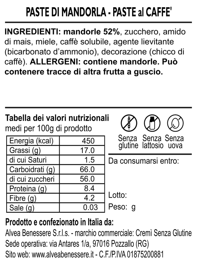 INGREDIENTI: mandorle 52%, zucchero, amido di mais, miele, caffè solubile, agente lievitante (bicarbonato d’ammonio), decorazione (chicco di caffè). ALLERGENI: contiene mandorle. Può contenere tracce di altra frutta a guscio.